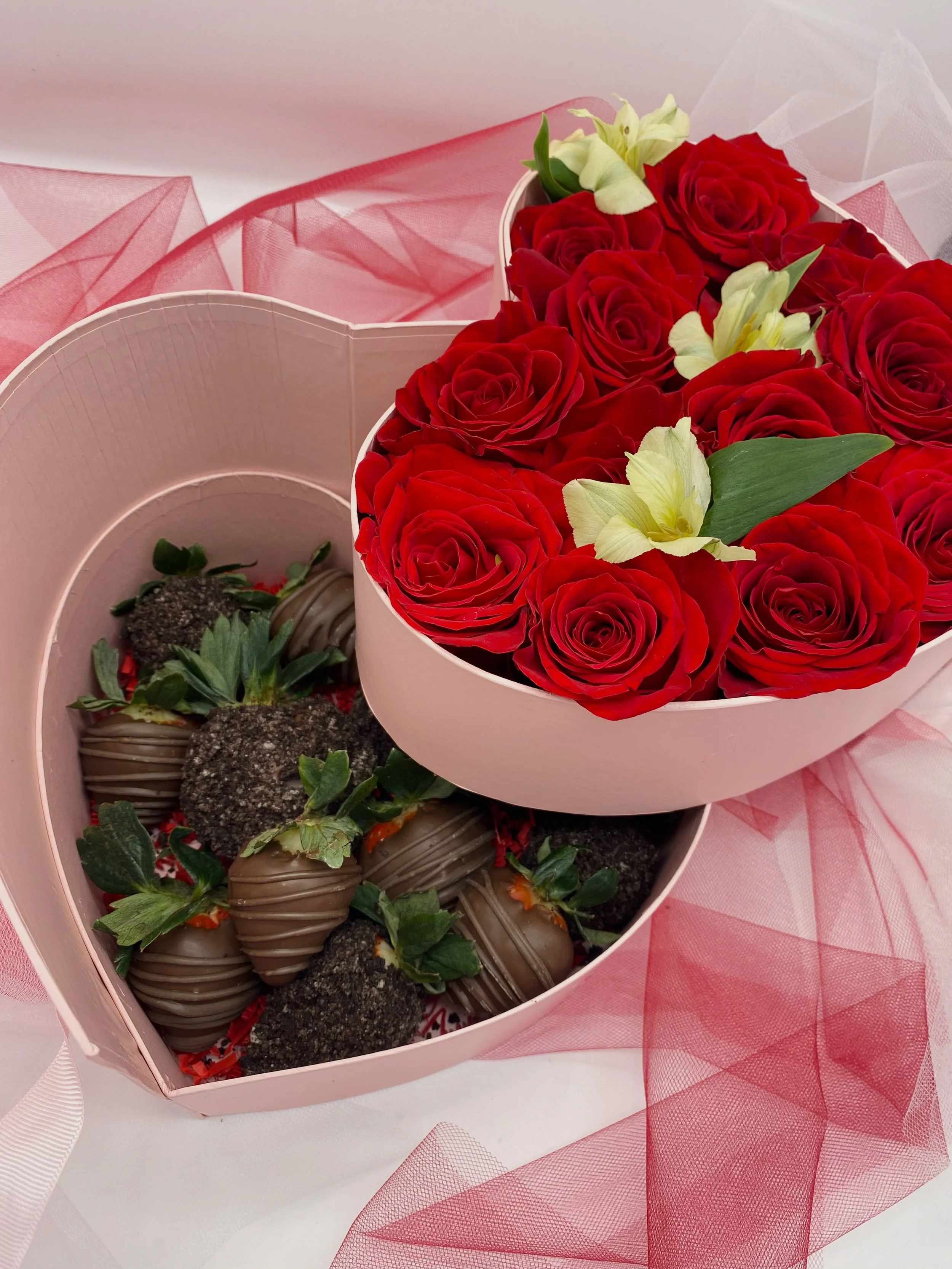 Introducing our Romantic Radiance: The Luxe Valentine Box – Where Love Blossoms and Indulgence Unfolds. This exquisite two-tiered heart-shaped box is a testament to refined elegance. In the first tier, behold a breathtaking arrangement of 12 meticulously chosen roses, each bloom expressing the depth of your affection.